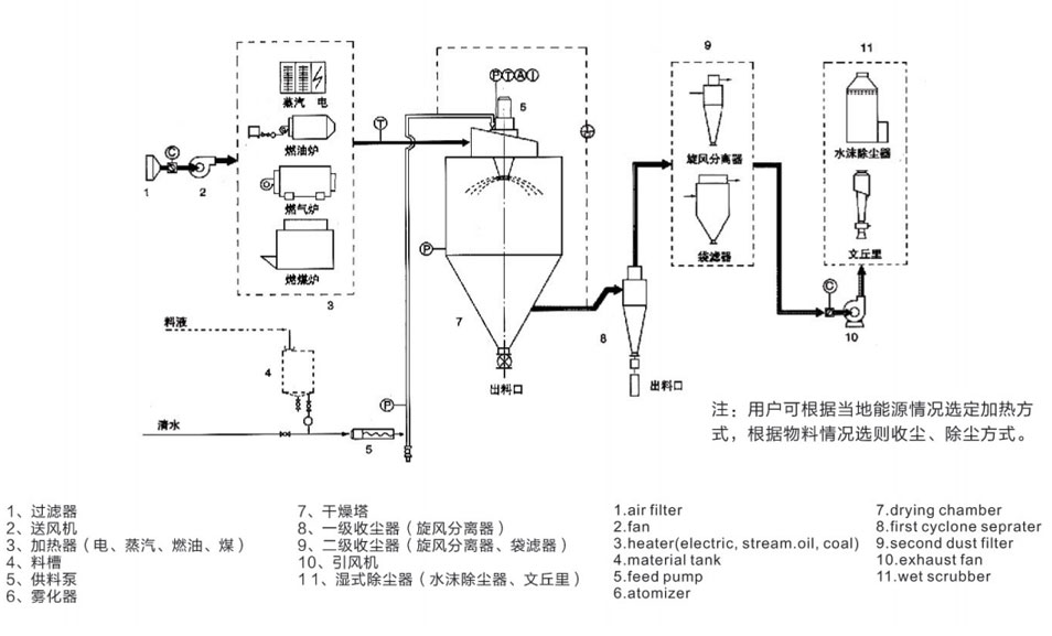噴霧干燥機為開式循環(huán),并流式,離心式霧化。干燥介質空氣經(jīng)過初、中效空氣過濾器過濾后根據(jù)操作指令由鼓風機吸取再經(jīng)加熱器加熱通過高效過濾器的熱風分配器進入噴霧干燥主塔。液體物料根據(jù)操作指令經(jīng)過蠕動泵,進入高速旋轉的離心噴頭,在離心力作用下被分散成小霧滴。在噴霧干燥主塔內(nèi),小霧滴與熱風在充分接觸,沿其特定路徑進行熱交換后被干燥成為產(chǎn)品,然后通過旋風分離器實現(xiàn)分離,固體物料被收集,氣體介質再經(jīng)過過濾后被排出。整套噴霧系統(tǒng)易清潔、無死角,符合GMP要求。